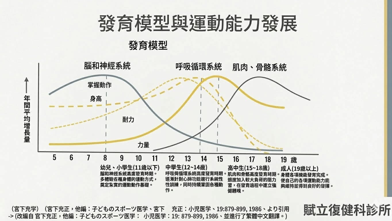 其實,孩子的身體發展有其「節律」!根據運動生理學經典的發育模型,不同年齡層的孩子,身體機能增長的高峰期大不相同。如果能在正確的黃金期給予適當的刺激,效果事半功倍!💪
